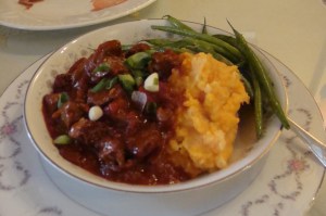 “Tender pieces of Morgan Valley Lamb slow cooked with Spanish Chorizo, Onion, Tomatoes, Garlic and Red Wine. Served over Sweet Potato Mashers and garnished with Haricot Vert.”