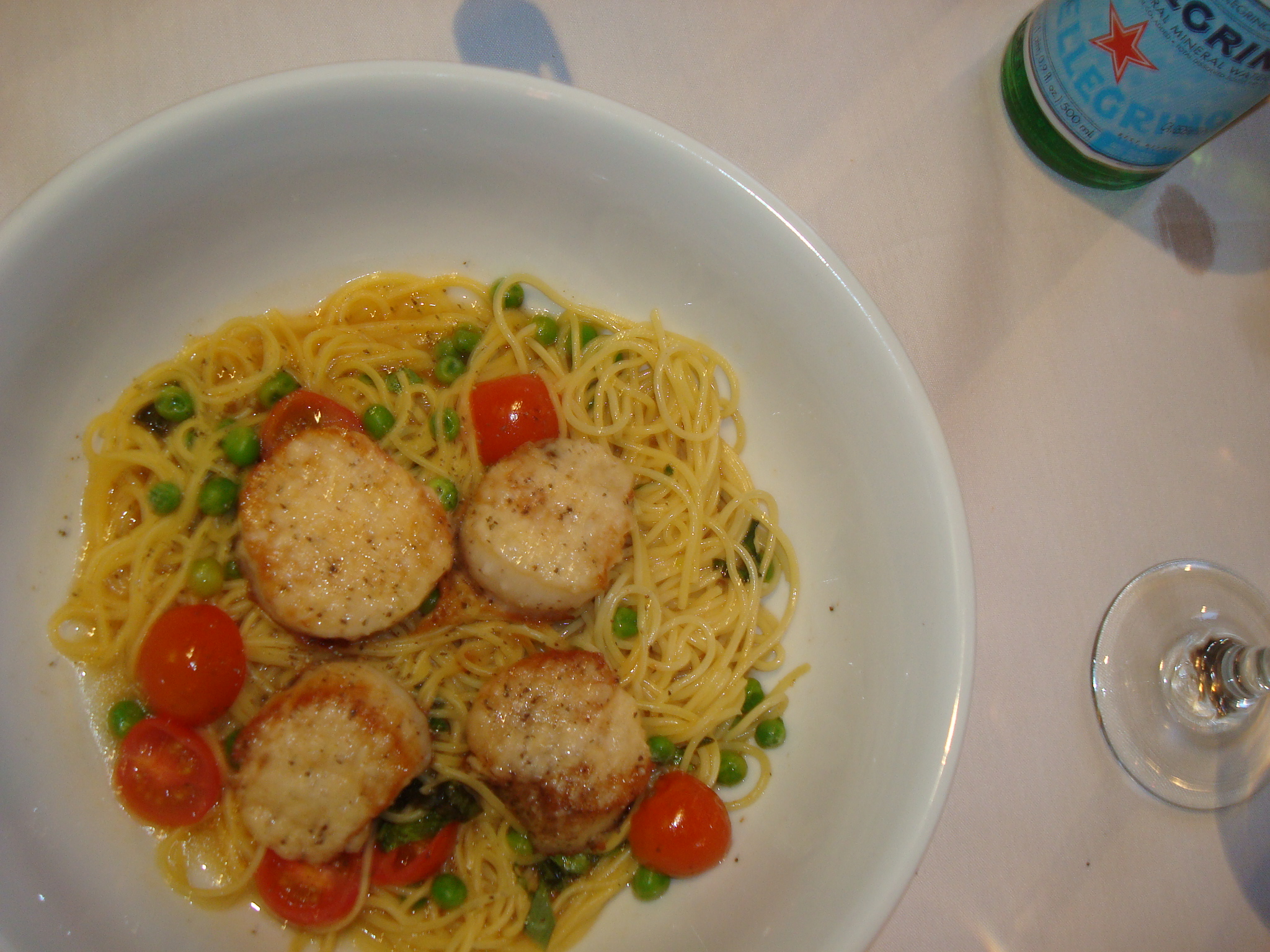 A bit underwhelming: Asiago Cheese Crusted Scallops • cappellini • tomato saffron broth • sweet peas • cherry tomato • arugula • basil