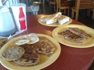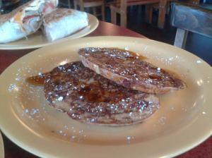 I had the Cinnamon Raisin Pecan bread (at the suggestion of the owner) for my unlimited French toast. I’m not a fan of French toast but it was unlimited and graciously well done. It was balanced and the raisins were sweet little morsels that surprised my palate when drenched in syrup. I hate raisins in anything, especially bread and cookies but they didn’t bother me in the toast. I’m not a fan of French toast but can say it was well executed, especially for someone who isn’t a sweet breakfast fan either. I had eggs and sausage on the side for a fuller breakfast but the eggs were overdone (sorry teenage worker) and the sausage bland. Man, I sound really whiny. 🙂