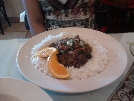 Beef Okra -” All-natural beef, okras, tomatoes, onions, and garlic cooked in a rich sauce and infused with herbs, spices and pomegranate molasses. Served with rice.”