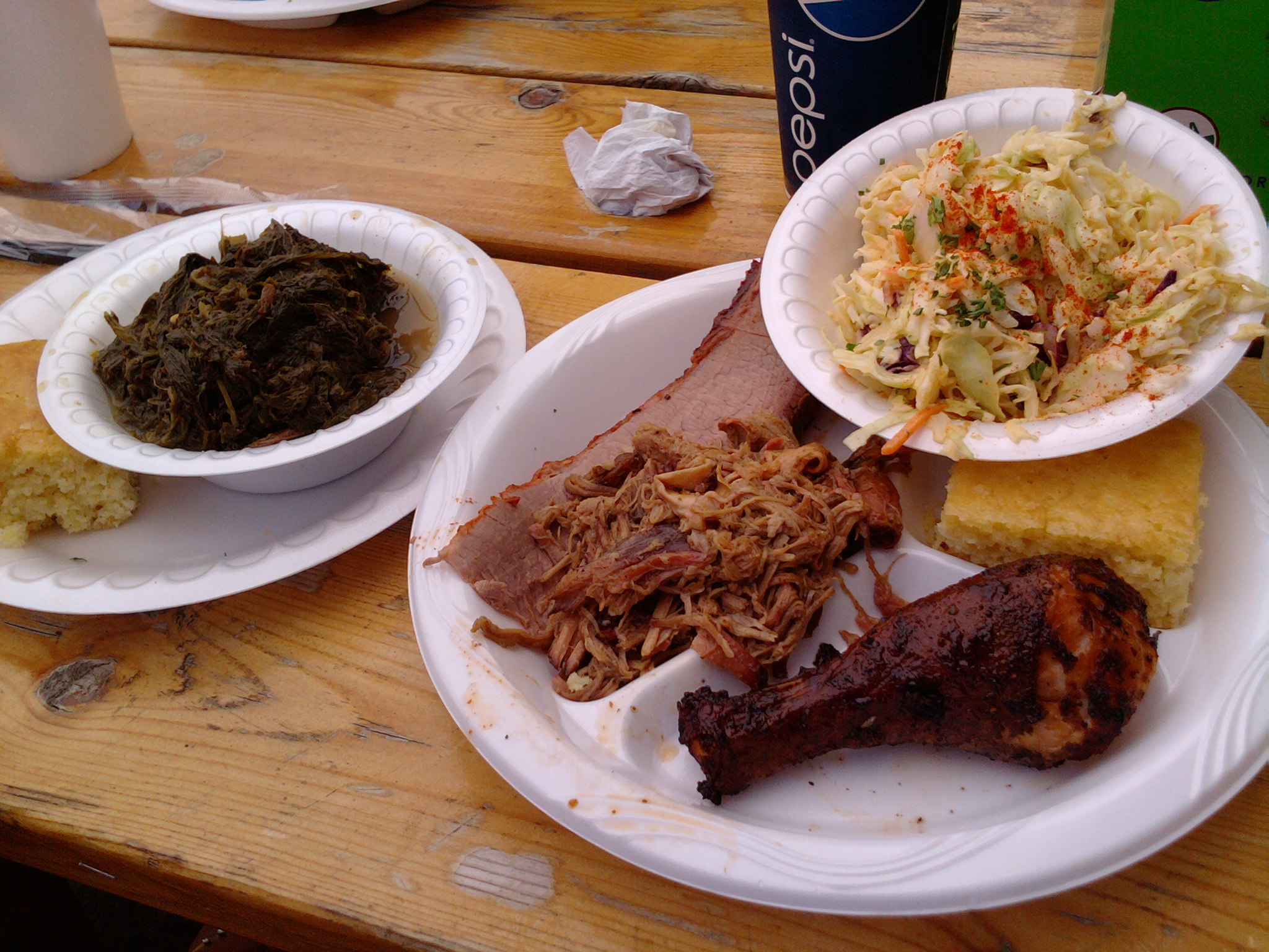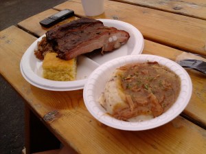 Slaw: Very well done. The cabbage was crisp and the seasoning just sweet enough that it didn’t overdo the flavors from the meats. It had a cool refreshing taste and was one helluva portion.